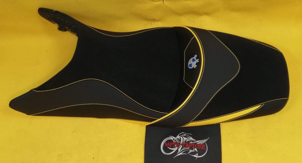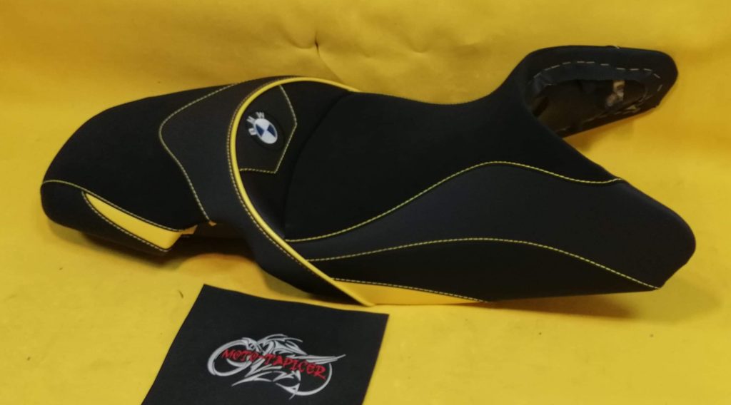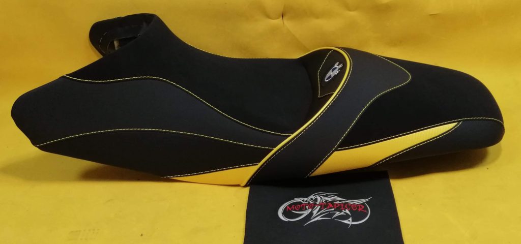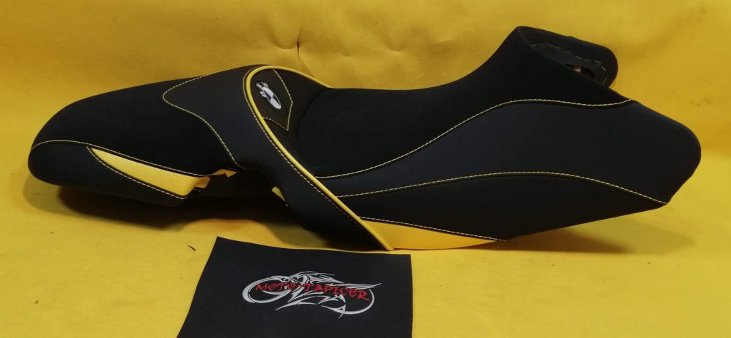 Siedziska kanapy wyprofilowane dopasowane do parametrów wagi i wzrostu, wyposażone we wkłady żelowe. Poszycie wykonane z syntetyków motocyklowych na siedziskach materiał antypoślizgowy. Kolorystyka dopasowana do motocykla. Haft komputerowy.