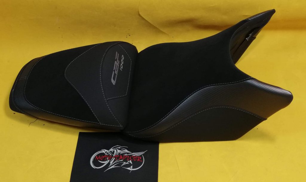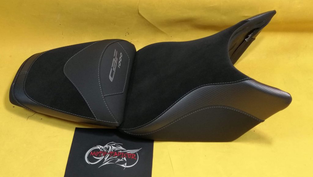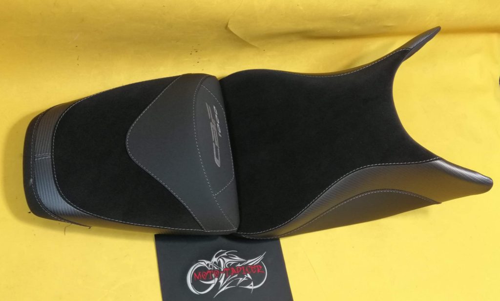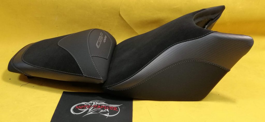 Siedziska kanap wyprofilowane oraz dopasowane do turystyki, wyposażone we wkłady żelowe. Poszycie wykonane z syntetyków motocyklowych na siedziskach materiał antypoślizgowy. Karbonowe grafitowe dodatki przeszycia oraz haft pod kolor motocykla.