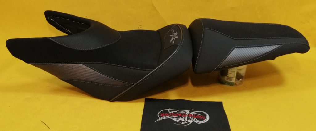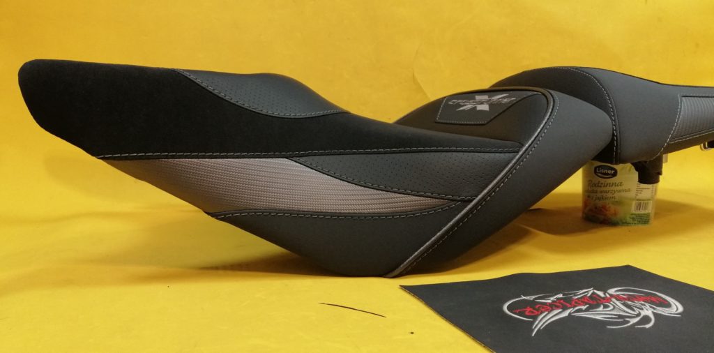 Kanapa wyprofilowana, siedziska z wkładem żelowym w antypoślizgu. Całość obszyta syntetykami motocyklowymi zdobiona haftem komputerowym.