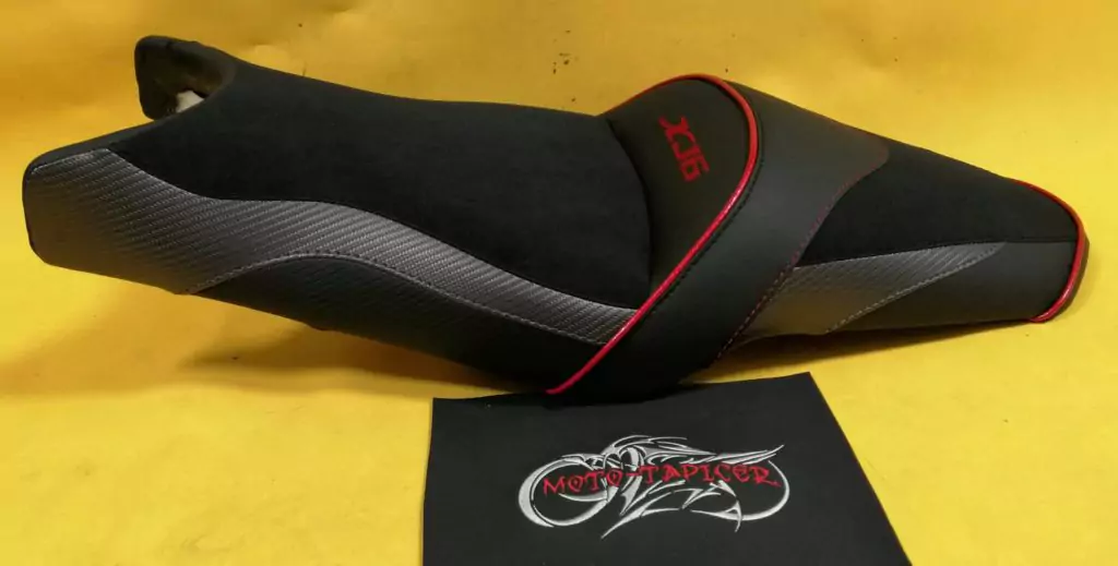 Poszycie wykonane z wysokiej jakości materiałów syntetycznych, a siedziska wykończone antypoślizgową powłoką, gwarantując stabilność podczas jazdy. Dodatkowe akcenty kolorystyczne dopasowane do motocykla oraz precyzyjny haft komputerowy podkreślają estetykę i elegancki wygląd kanapy.