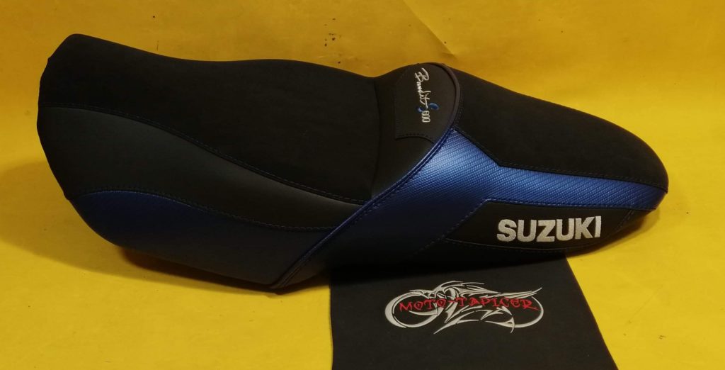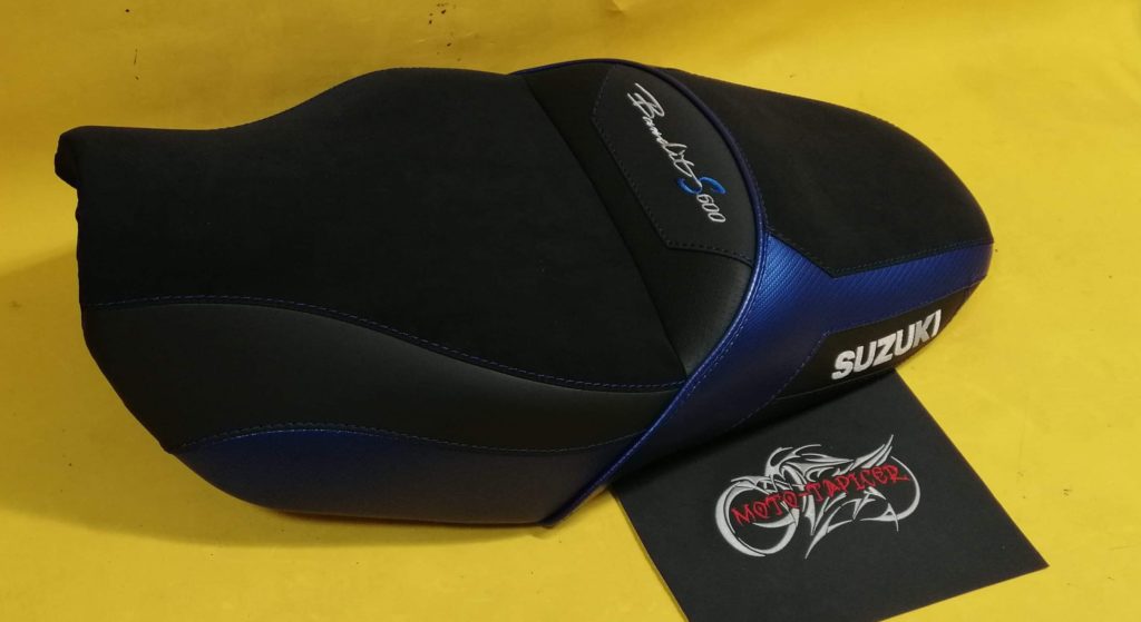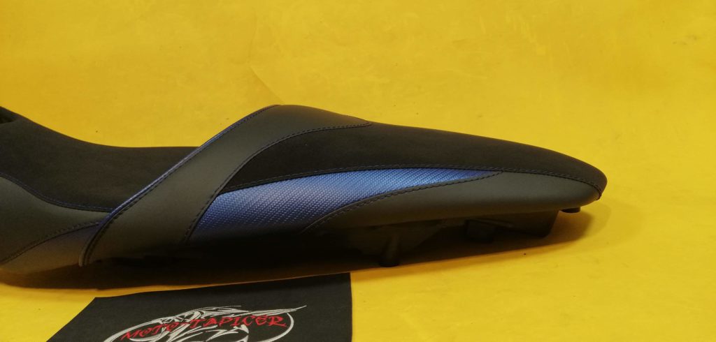 Kanapa rozbudowana i wyprofilowana do turystyki z wkładami żelowymi. Poszycie wykonane z syntetyków motocyklowych na siedziskach syntetyczna alkantara. Dodatki granatowego carbonu oraz haft pod kolor motocykla.