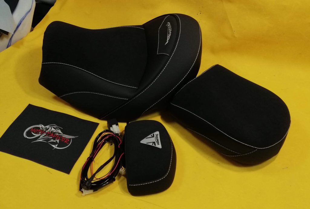 Kanapa rozbudowana wyprofilowana z wkładem żelowym oraz matą grzewczą w siedzisku idealna pod turystykę. Poszycie antypoślizgowe, zdobione kontrastującymi przeszyciami oraz haftem. Oparcie stylizowane pod kanapy.