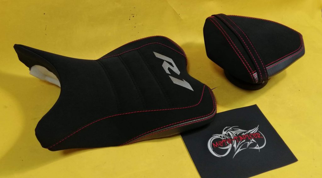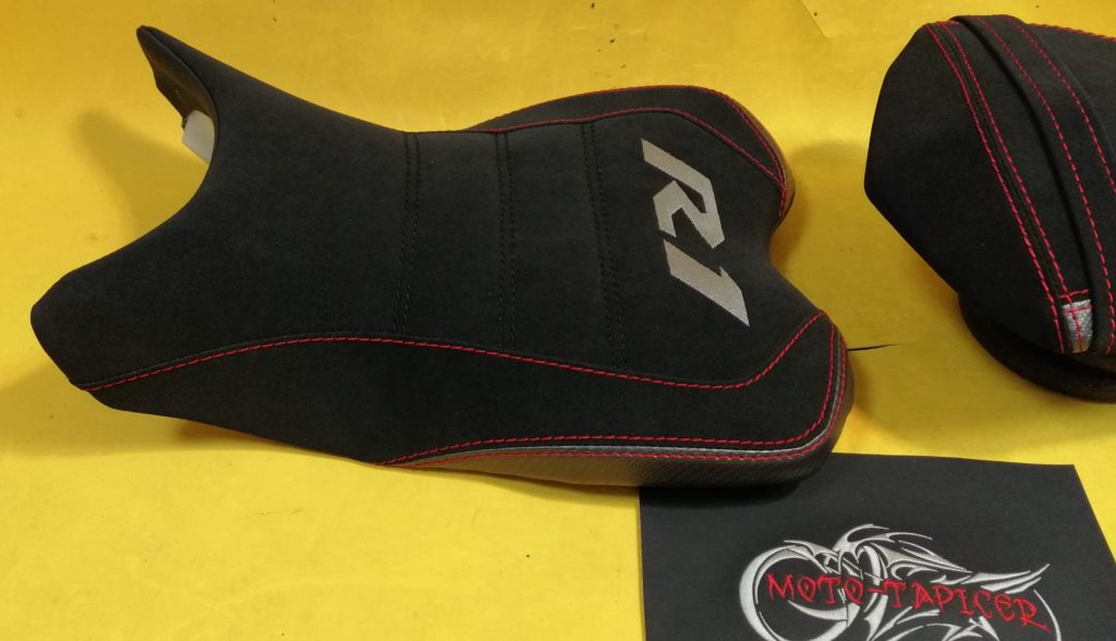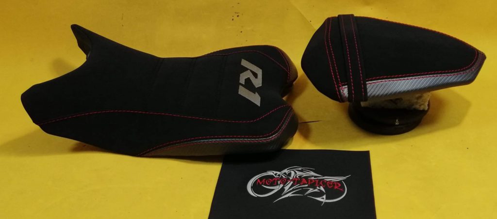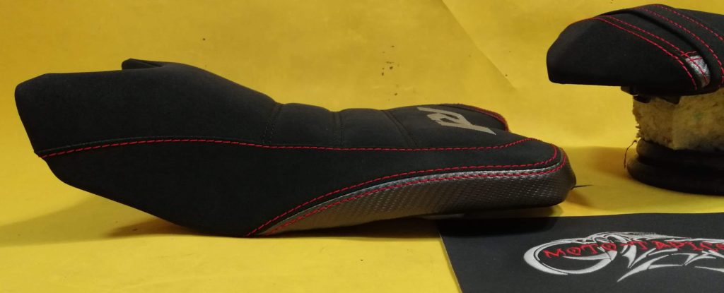 Siedziska wyprofilowane oraz indywidualnie dopasowane. Materiał antypoślizgowy na siedziskach, wypełnienia karbonowe. Kolorystyka materiału oraz przeszyć nawiązująca do motocykla.